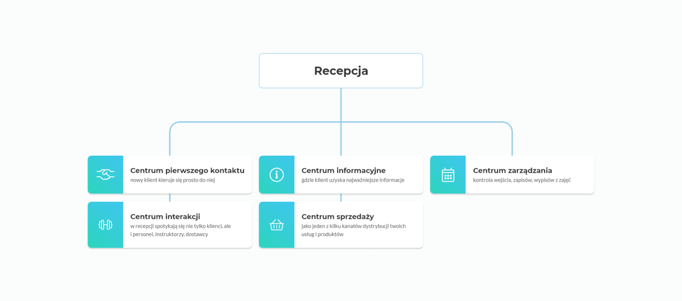- centrum interakcji – w recepcji spotykają się nie tylko klienci, ale i personel, instruktorzy, dostawcy
